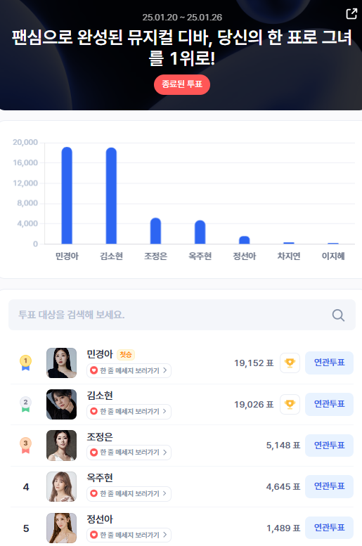 Juhyeon Ok, who clinched fourth place with 4,645 votes, is adored for her charisma and exceptional singing skills on the musical stage, while Seonah Jeong, with 1,489 votes, made it to the top with her passionate stage manner and emotional delivery. Both actresses enjoy consistent fan support.