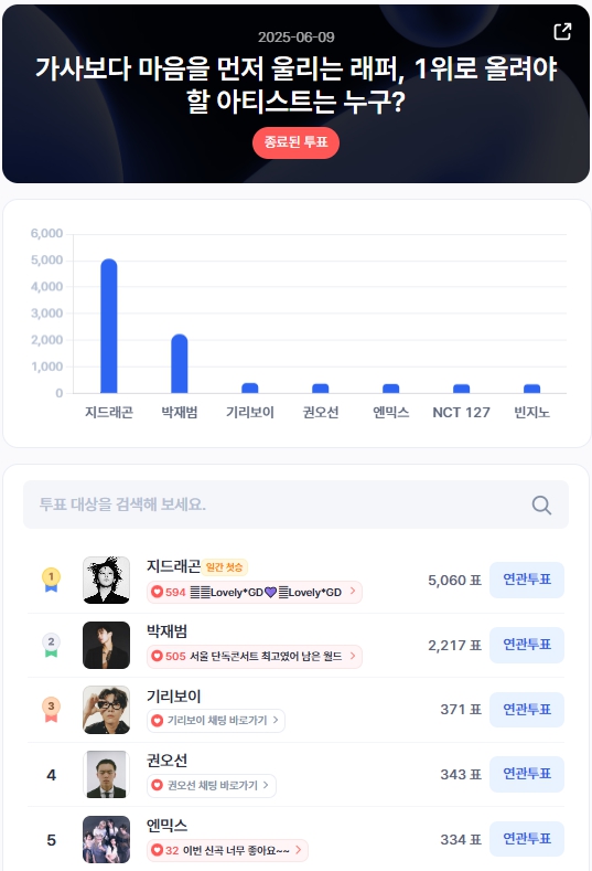 Giriboy ranked third with 371 votes, and Kwon Oh-sun came in fourth with 343 votes, each garnering support from a loyal fanbase with their unique music worlds.