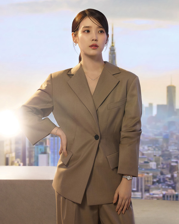 In another cut, IU completes a formal look by matching a sophisticated brown suit with the ETER silver collection.