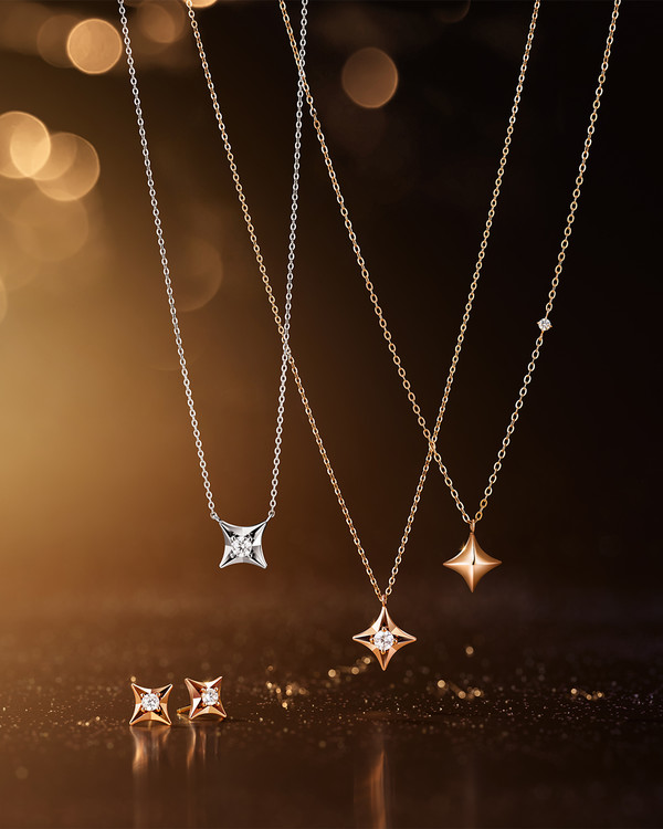 Featuring precise cuts that reflect like starlight with movement, it is available in a variety of materials including rose gold, white gold, and silver, allowing for a wide range of choices according to preferences.